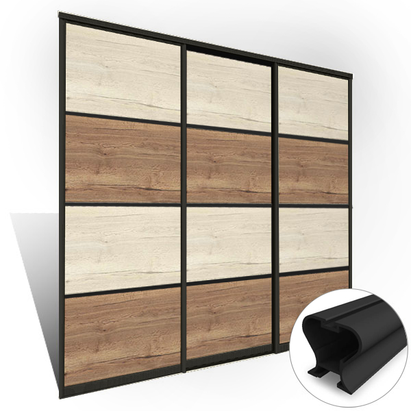 Karakteristike: | Klizna vrata 3 kom; Rukohvat X sa leve i desne strane u boji CRNA, sa kanalom za četkicu; Set točkića kompatibilan sa rukohvatom; 1 kom gornje i 1 kom donje šine u širini svetlog otvora; Ispuna: svi pločasti materijali debljine od 4-18mm, staklo 4mm , ogledalo 4mm. |